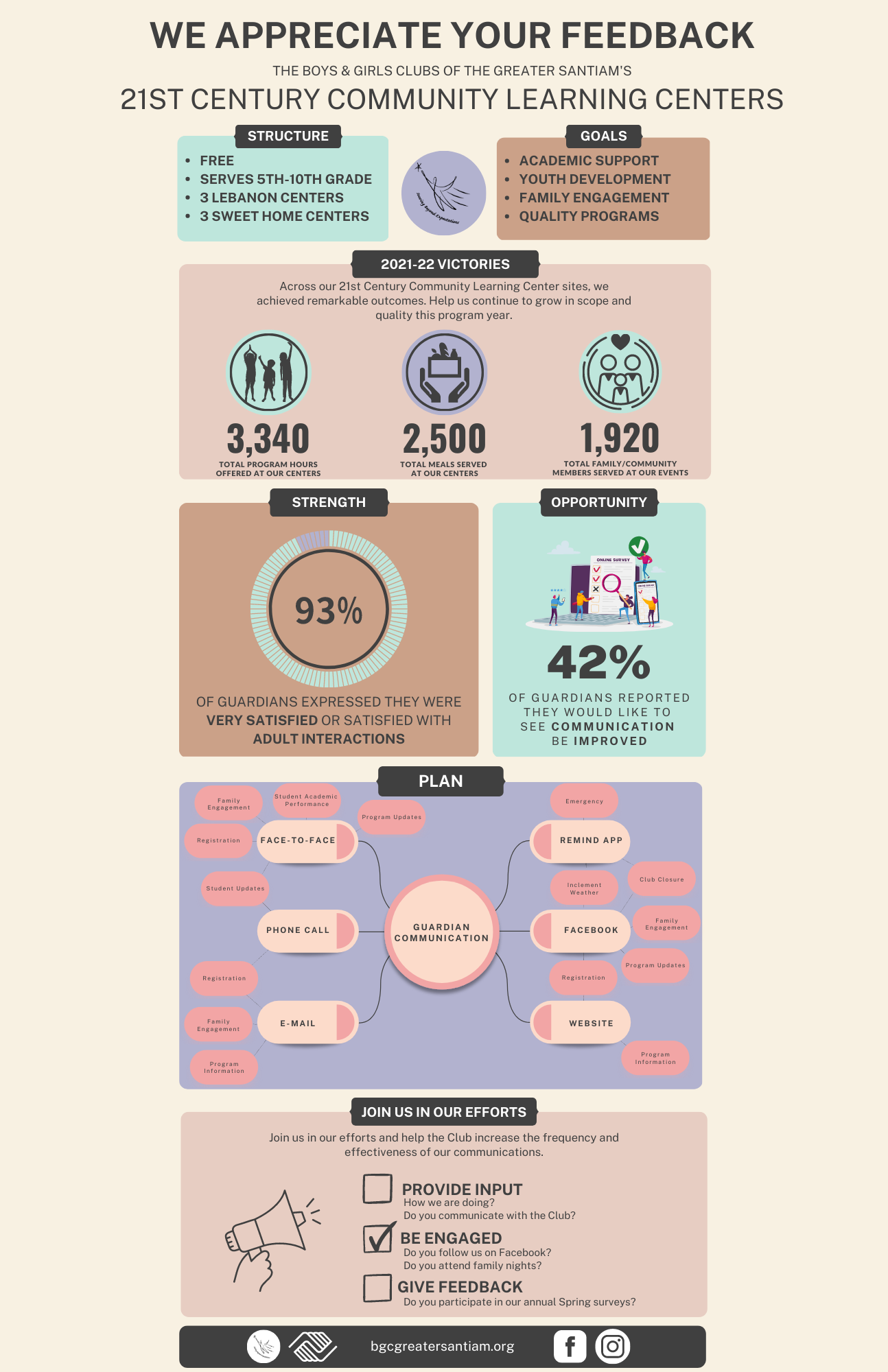 The goal of our 21st CCLC program is to increase academic achievement, engage students in robust activities, and improve family member involvement. In addition, our centers offer meals at our programs and family events to address food insecurity.